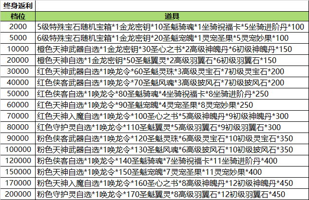 1.用户累计充值金额达到以上金额,即可获得对应金额礼包(每个礼包只能领取一次)